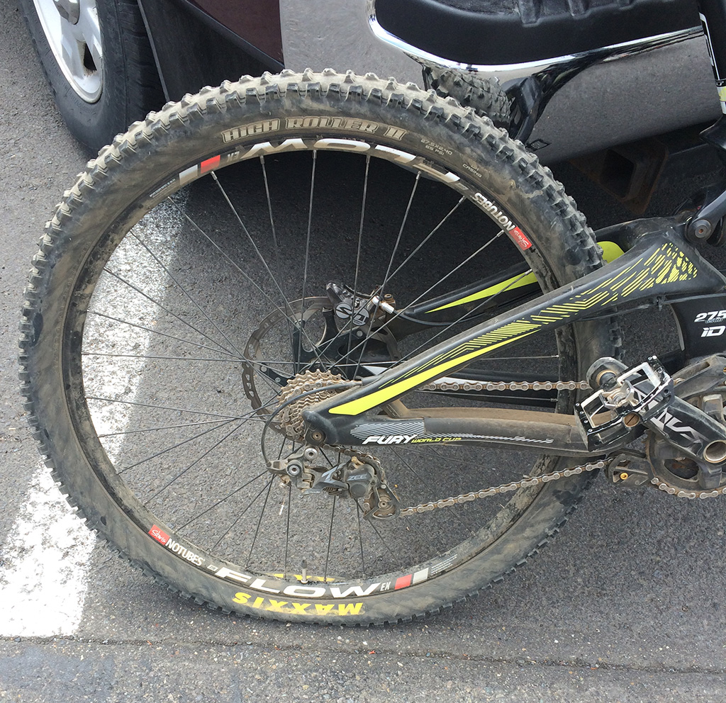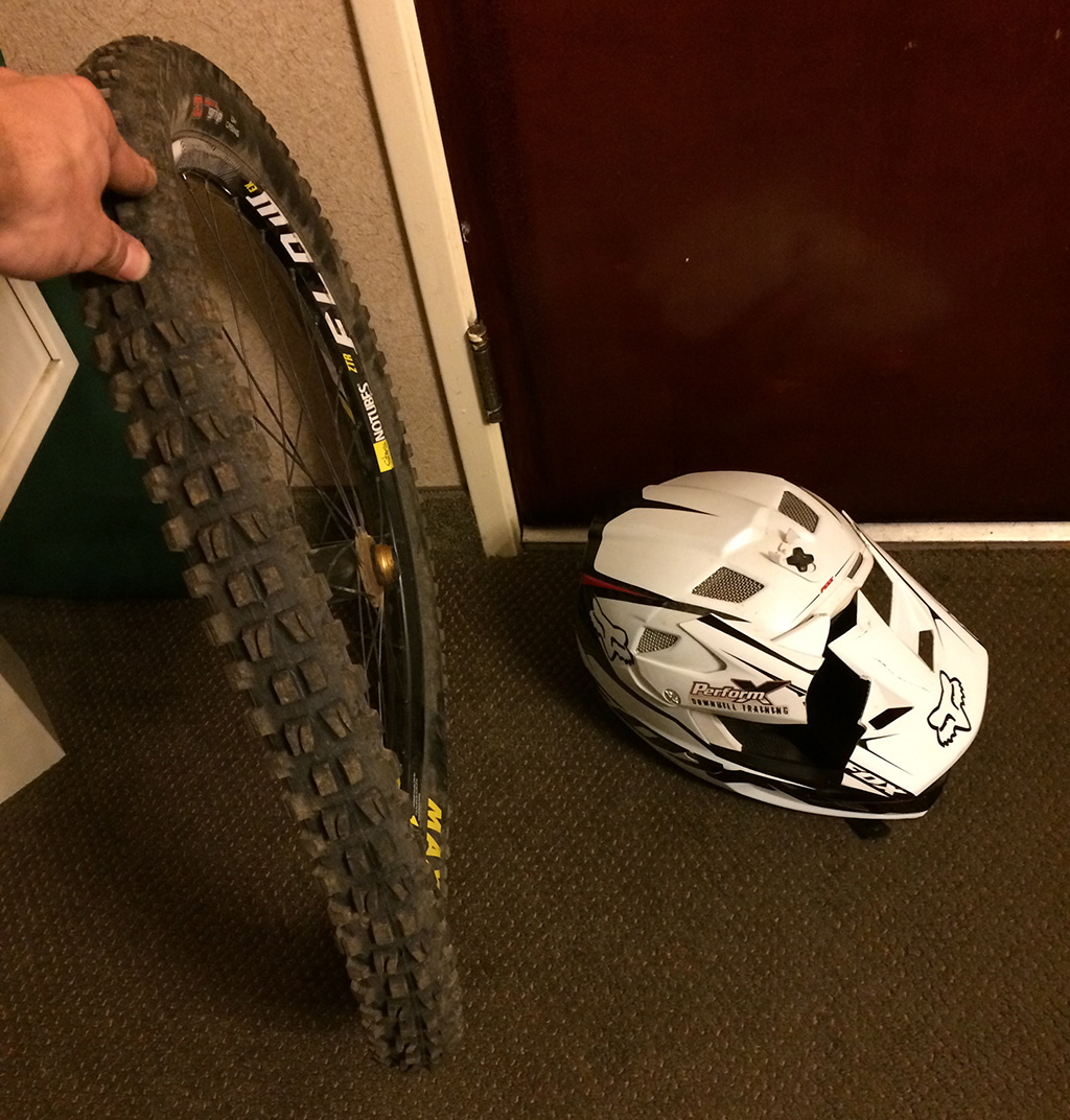 How can a flat tire be the best father’s day present that I received this past weekend? My son Levi and I were in Mount Hood, Oregon at the NW Cup downhill mountain bike race this past weekend and towards the end of the first training day he was going too fast into a tight corner, went off the track and hit a tree. As you can see from the pictures he destroyed his front wheel and smashed his helmet visor.