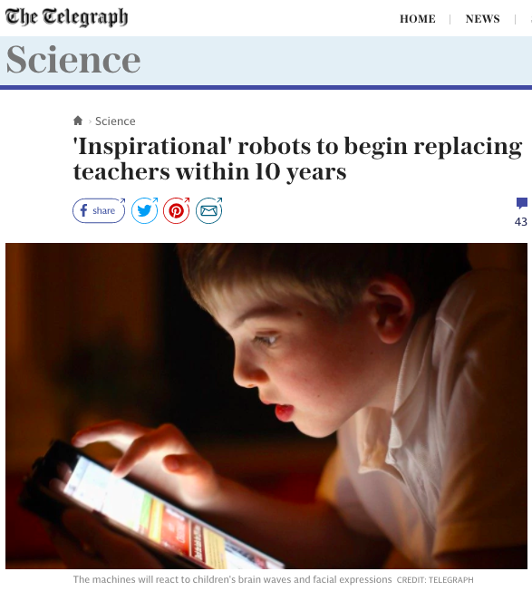 Bodkin, H. (2017, September 11). “Inspirational” robots to begin replacing teachers within 10 years. The Telegraph. Retrieved from http://www.telegraph.co.uk/science/2017/09/11/inspirational-robots-begin-replacing-teachers-within-10-years/