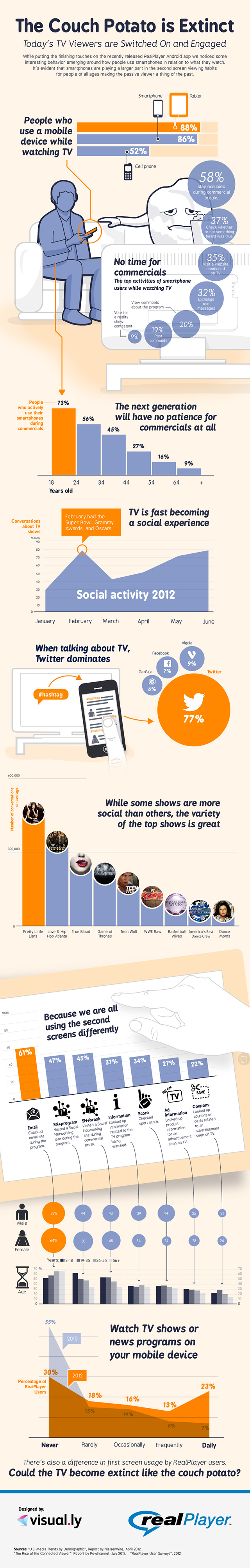 It would be fair to say that we don’t watch any less TV but we do spend less time watching and have total control over when and where we watch the shows we like. The following infographic does a fine job of summarizing the changes we are seeing in the Couch Potato. I don’t know if I would say that the Couch Potato is extinct but broadband internet and mobile are definitely serving TV up in a different dish.